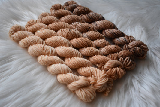 Explore our delightful Mini Hand-Dyed Yarn Skeins! Perfect for adding pops of color to your projects or for intricate colorwork.