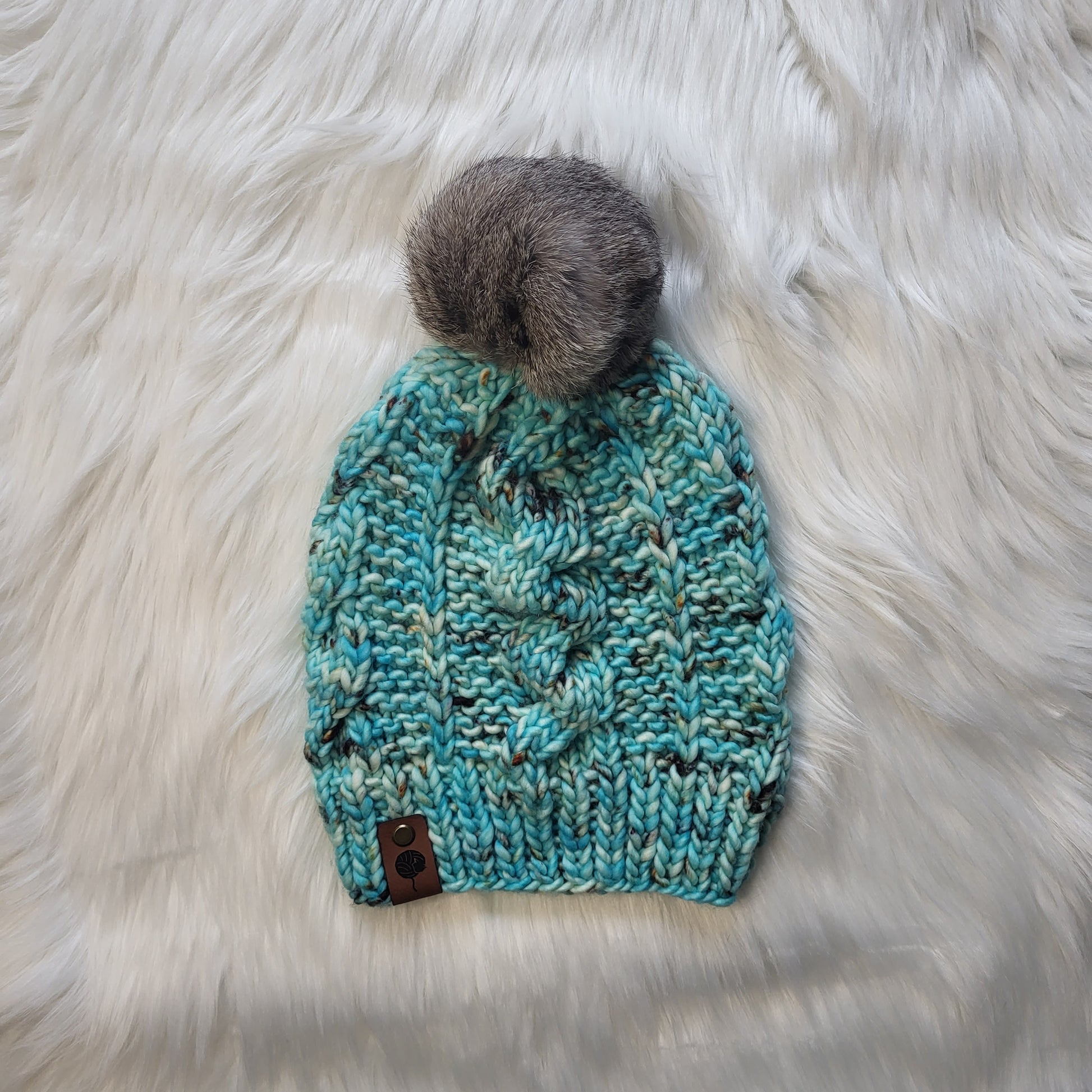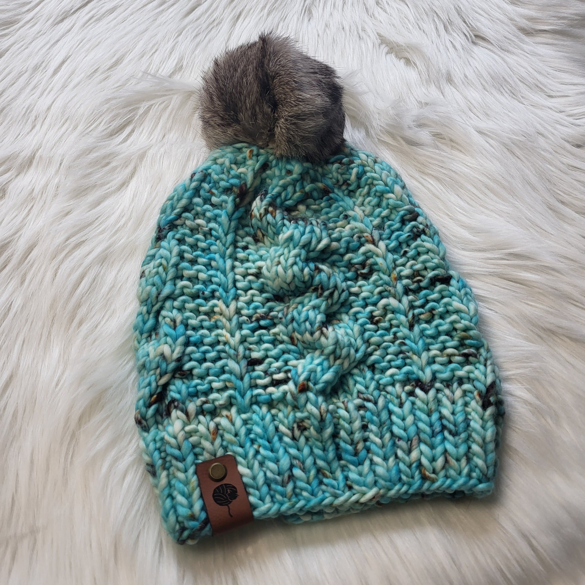 This chunky knit beanie is handmade in Robin's Egg yarn, which is my hand-dyed yarn only available at in-person events this season! It is soft to the touch, and perfect for the cold! This twisted beanie is super cute and comfy. The adult sizing is stretchy for your comfort. It is warm and extremely comfortable to wear throughout the cold weather. They do not come with a fold-over brim.
