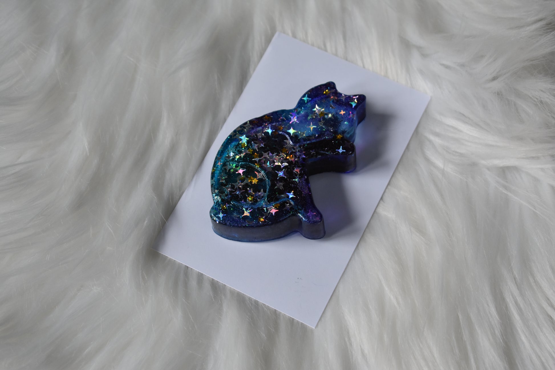 This cute cat-shaped magnet is handmade from resin and is about 3 inches tall. It has a smooth, shiny finish and sticks to any magnetic surface like a fridge or locker. Perfect for cat lovers or as a fun little decoration!
