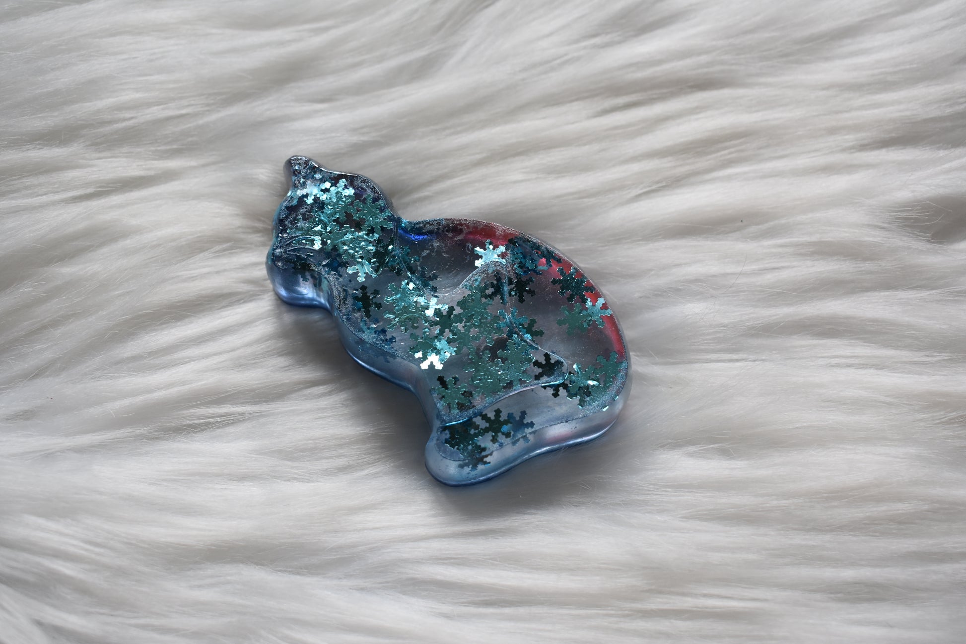 This cute cat-shaped magnet is handmade from resin and is about 3 inches tall. It has a smooth, shiny finish and sticks to any magnetic surface like a fridge or locker. Perfect for cat lovers or as a fun little decoration!
