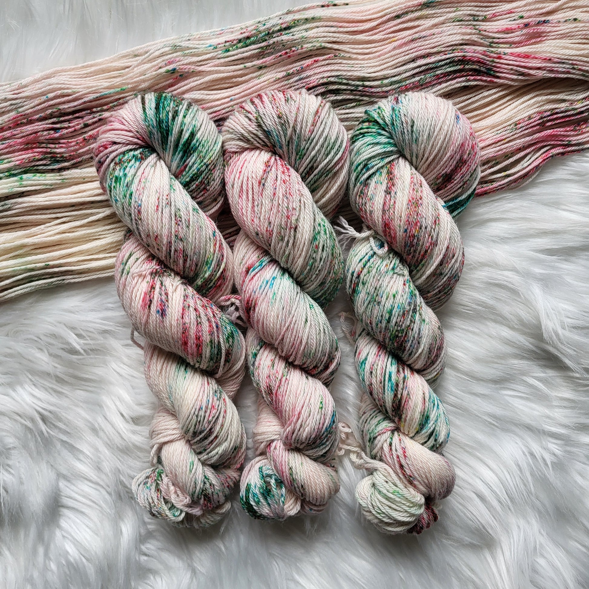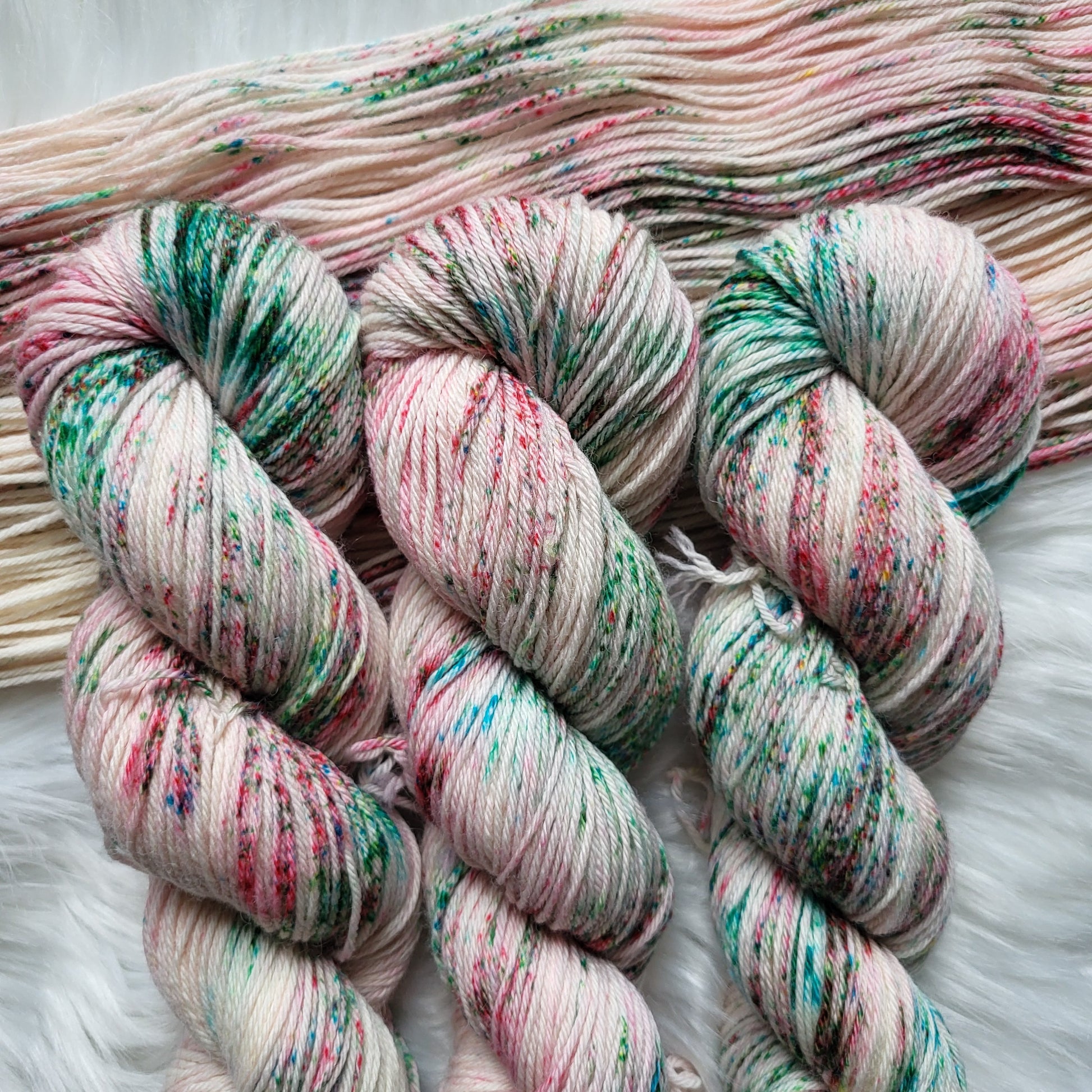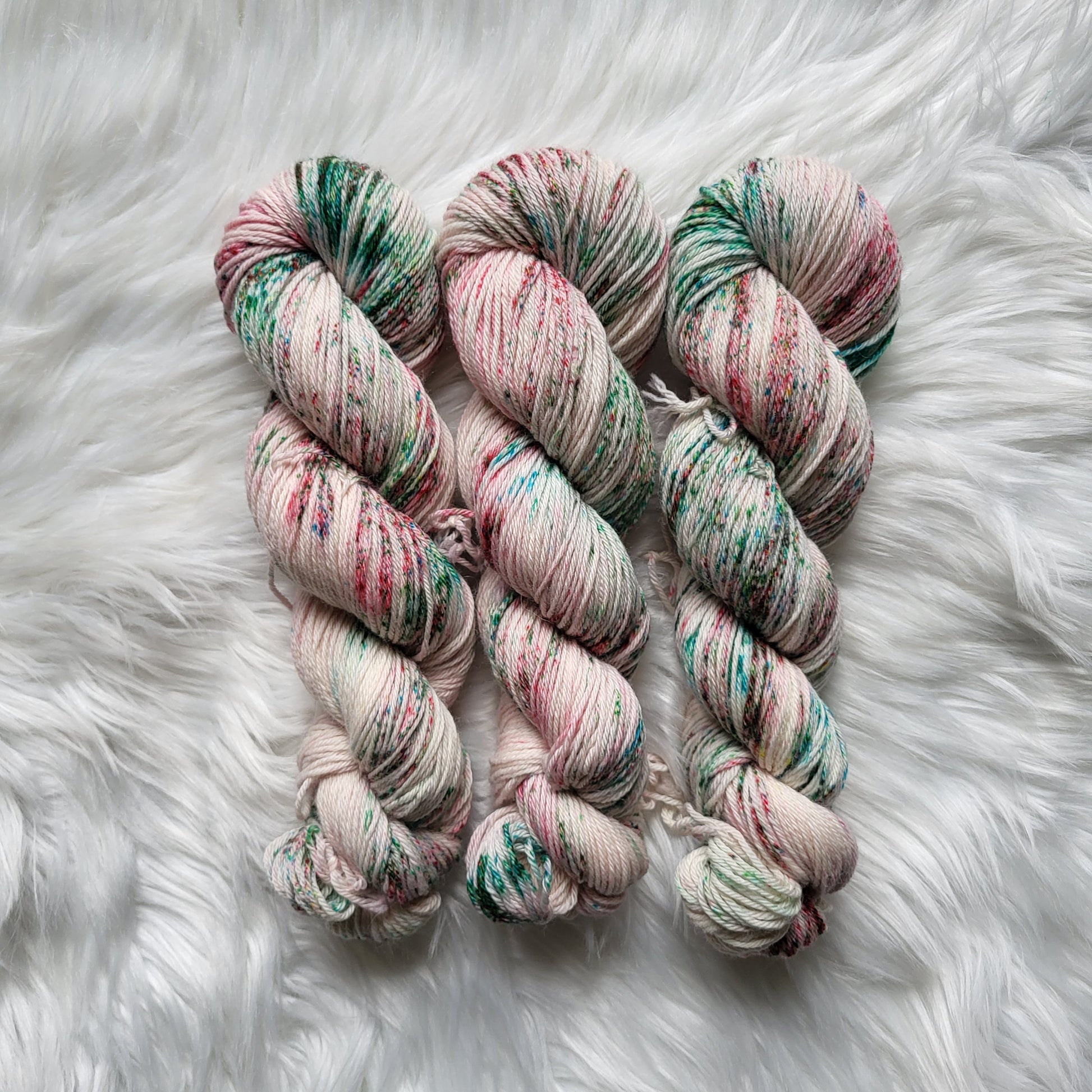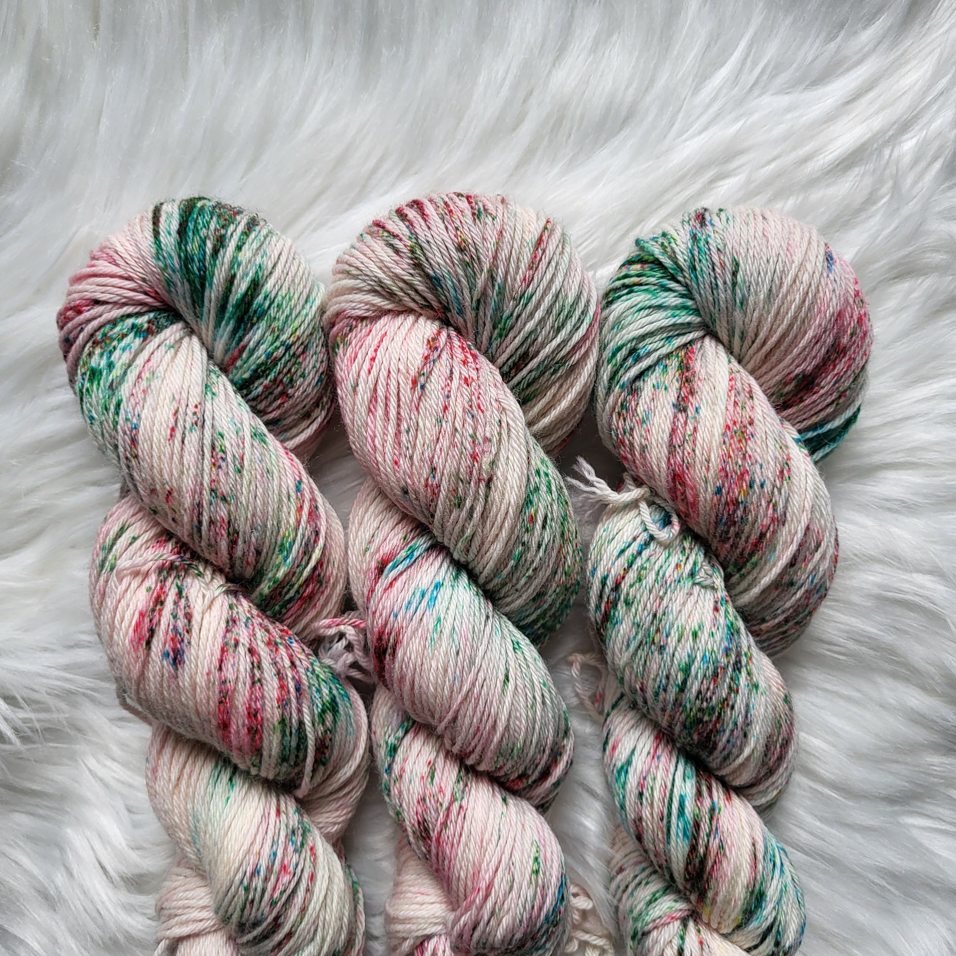 December Holly is a one-of-a-kind indie-dyed yarn from Chronicles of Cheryl dyed in micro batches. These yarns are spun from certified mulesing-free 100% superwash merino wool, and is exactly the yarn everyone’s favorite sweater pattern calls for. The classic 4-ply construction means this durable yarn holds up to washing and wearing.