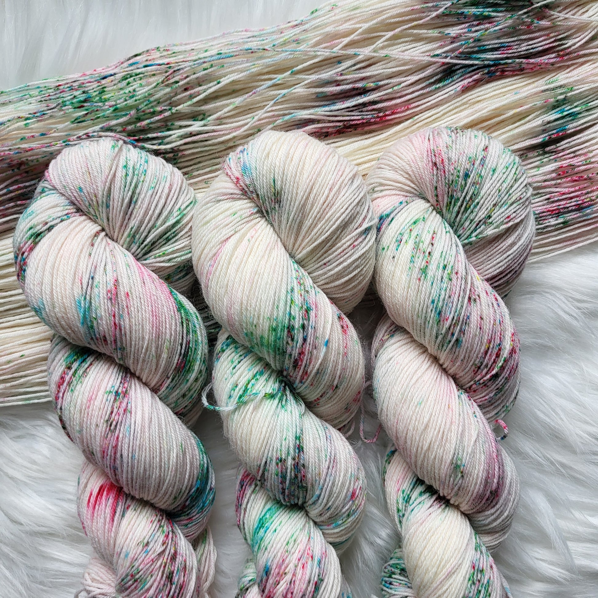 December Holly is an indie-dyed yarn from Chronicles of Cheryl dyed in small batches with a beautiful fingering weight yarn. This yarn is perfect for working up socks since the superwash merino wool, with all its softness and warmth, comes from Uruguay. It is also blended with a bit of nylon for added strength and heavy duty wear. These skeins would be perfect for a shawl or special pair of socks to celebrate the new year. There are only 10 skeins available of this beautiful hand-dyed yarn!