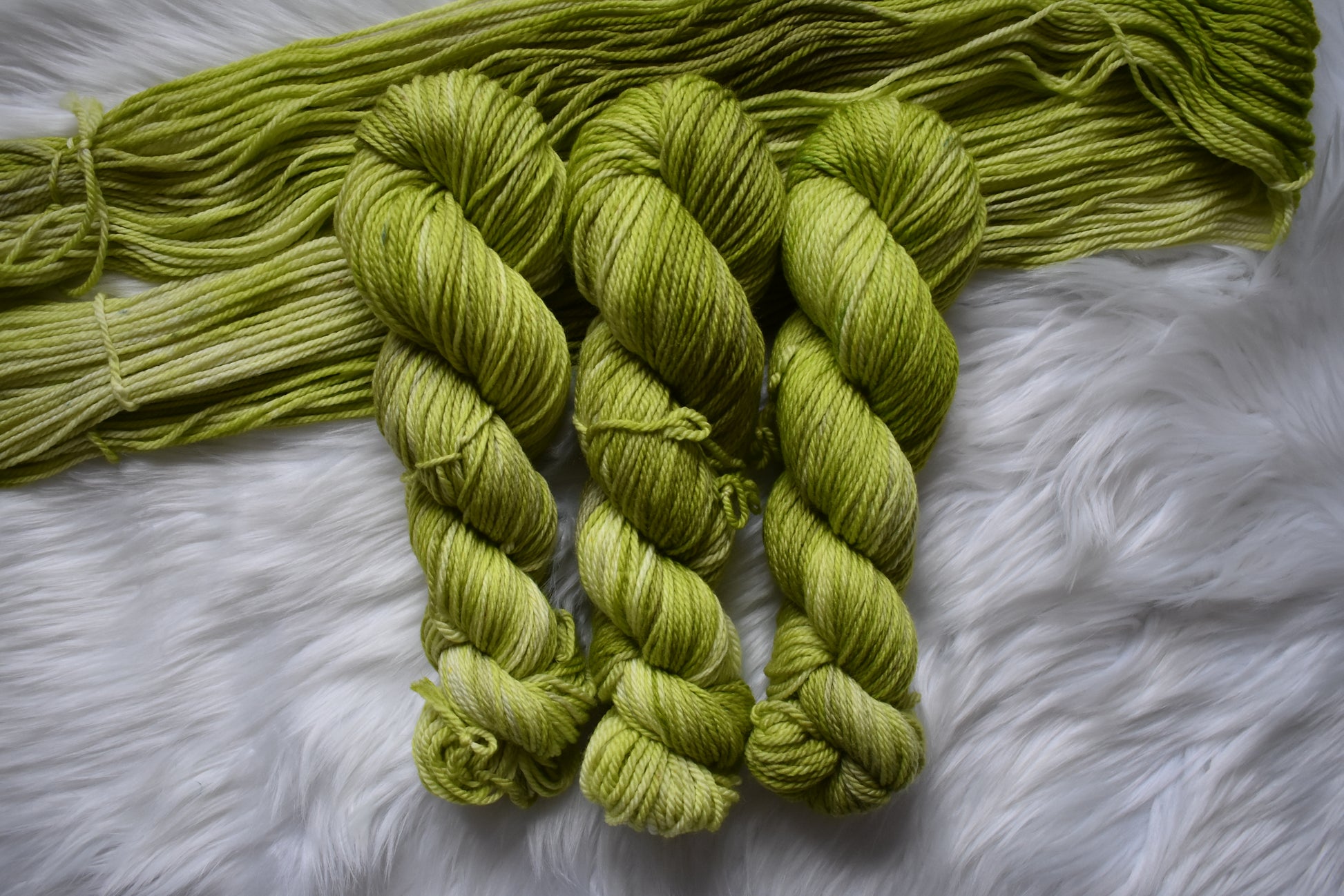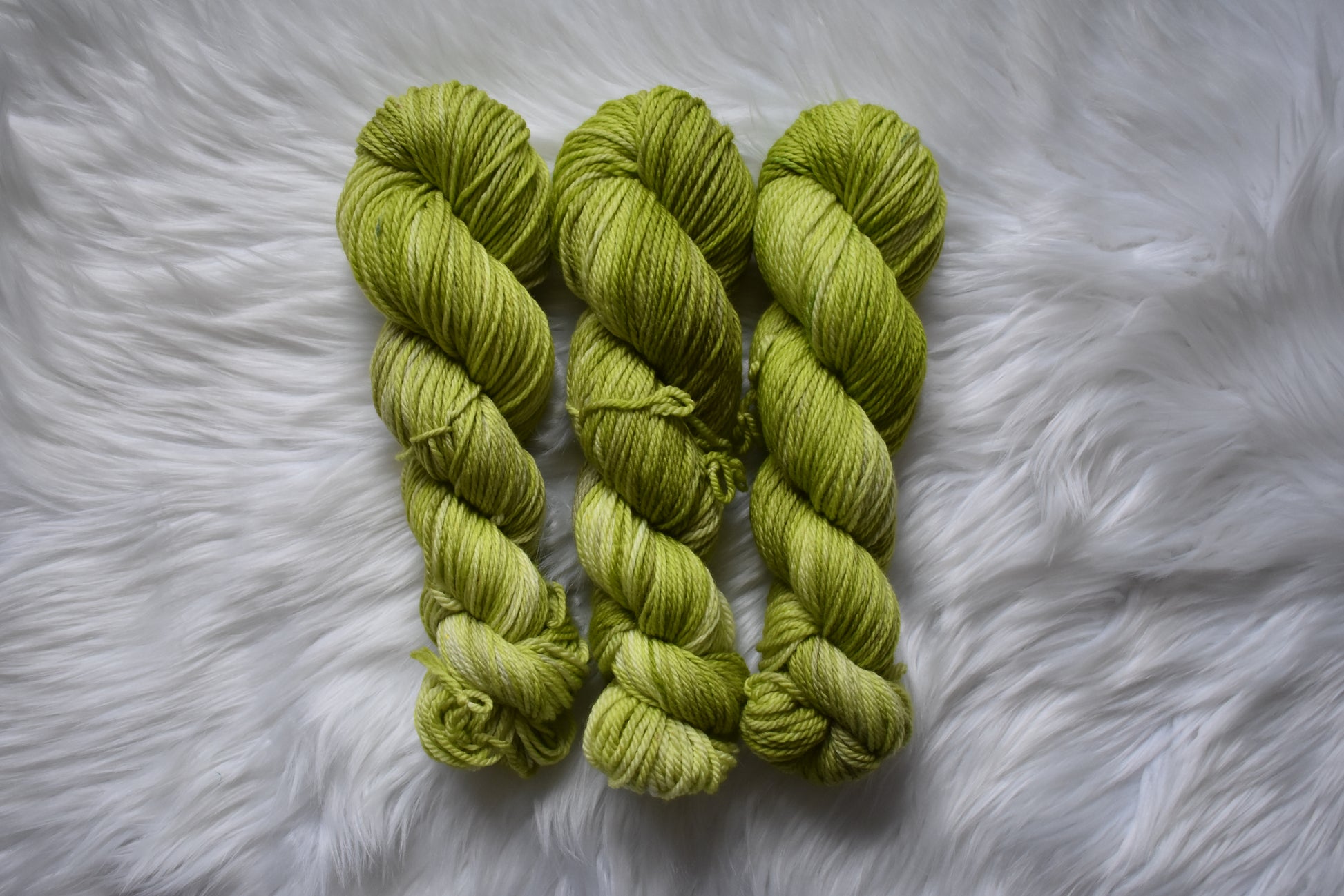 Iced Matcha Latte is an indie-dyed yarn from Chronicles of Cheryl dyed in micro batches. This 3-ply yarn brings beautiful stitch definition to every project. It begs to be knit into the coziest sweaters, with or without cables and fancy stitches. It is so cuddly, it will be your new go-to yarn for cold weather projects.
