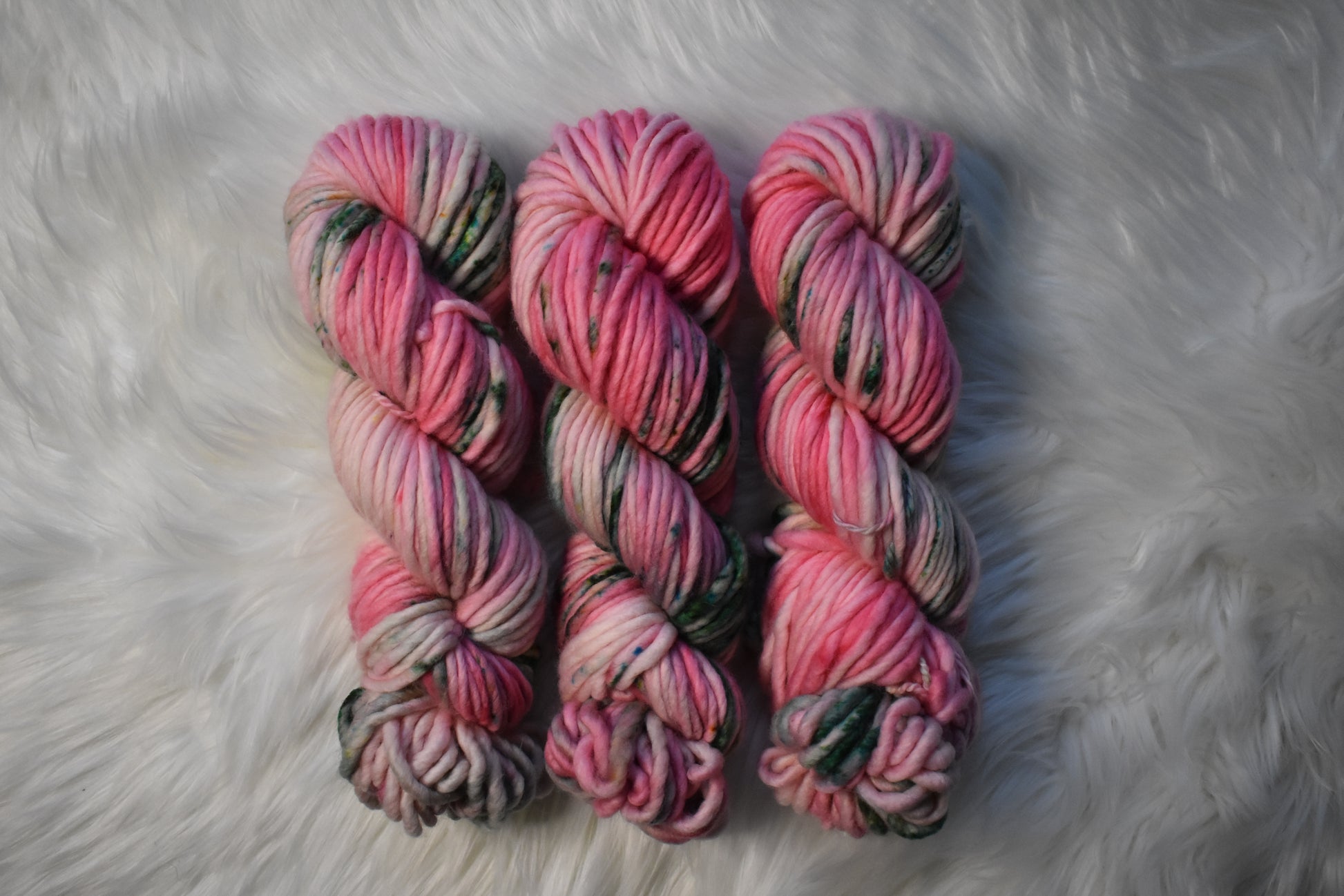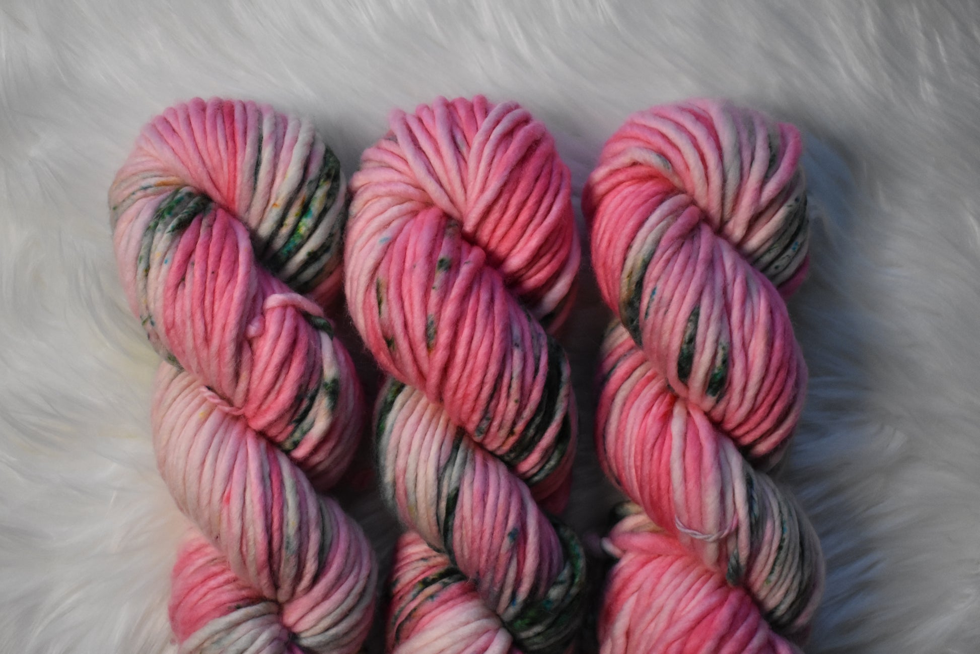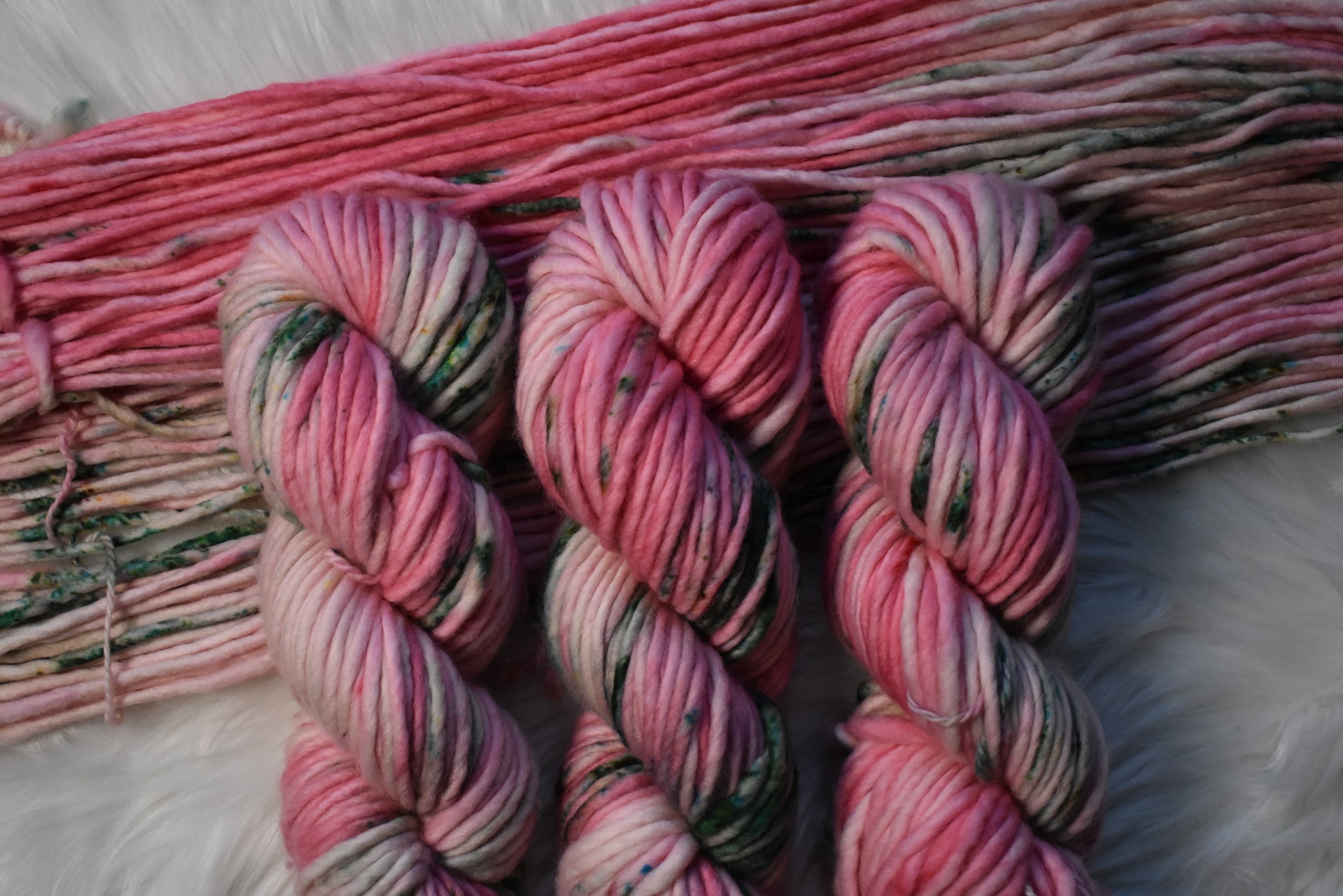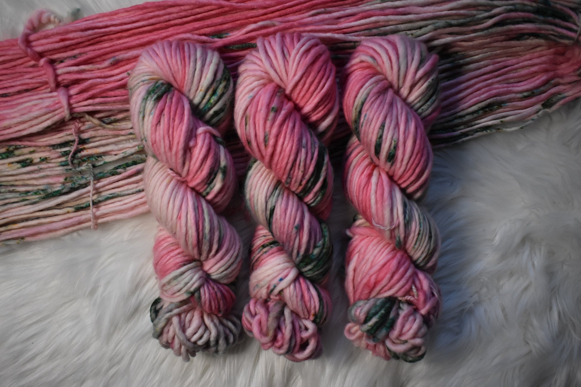 January Carnations is a hand-dyed yarn in micro batches. Spun from primarily Merino Wool, this single ply yarn is a truly luxurious option for chunky knits. If you are a fan of Malabrigo Rasta, this yarn is similar, bringing incredible softness to your favorite quick-to-knit projects.