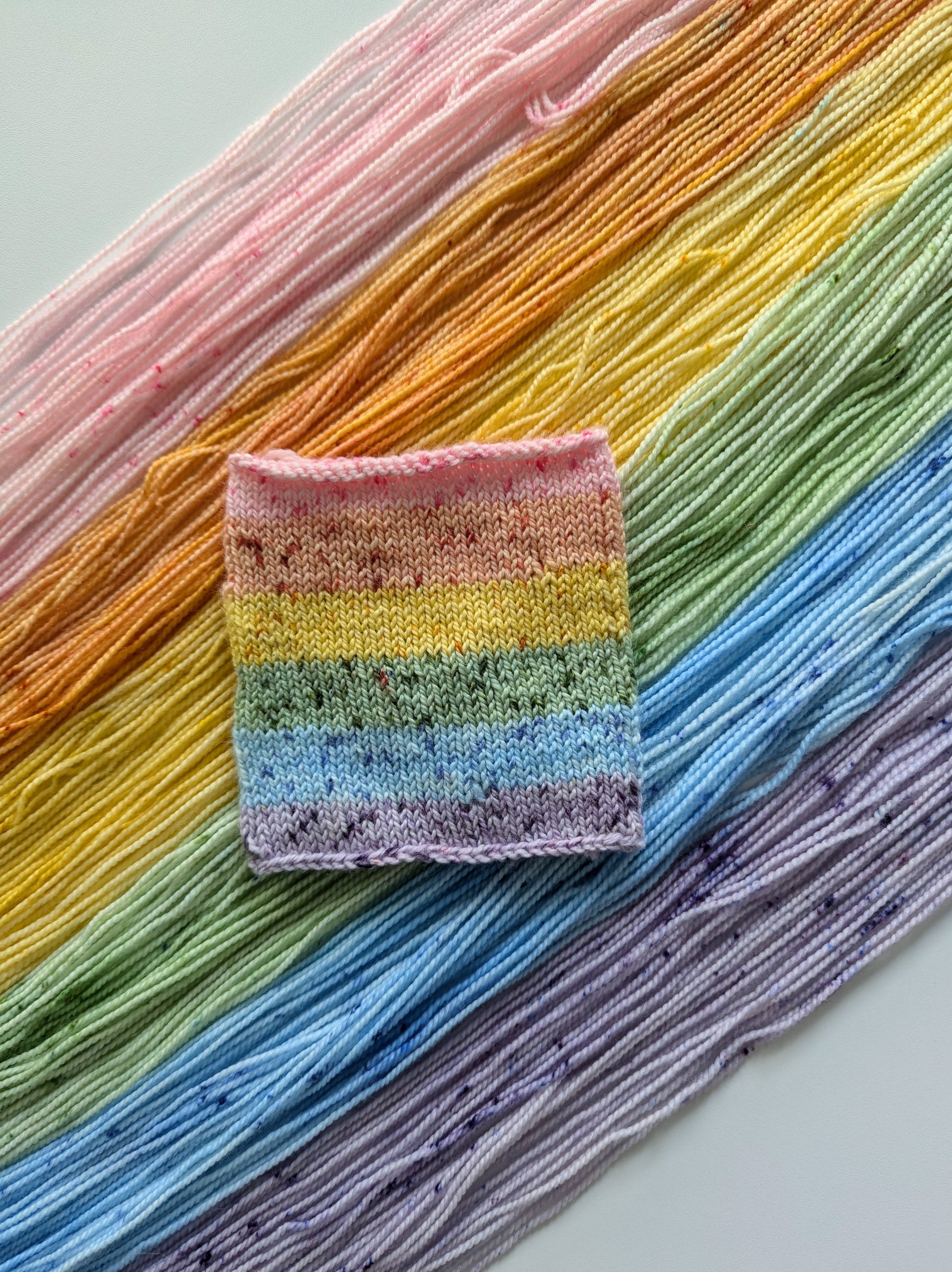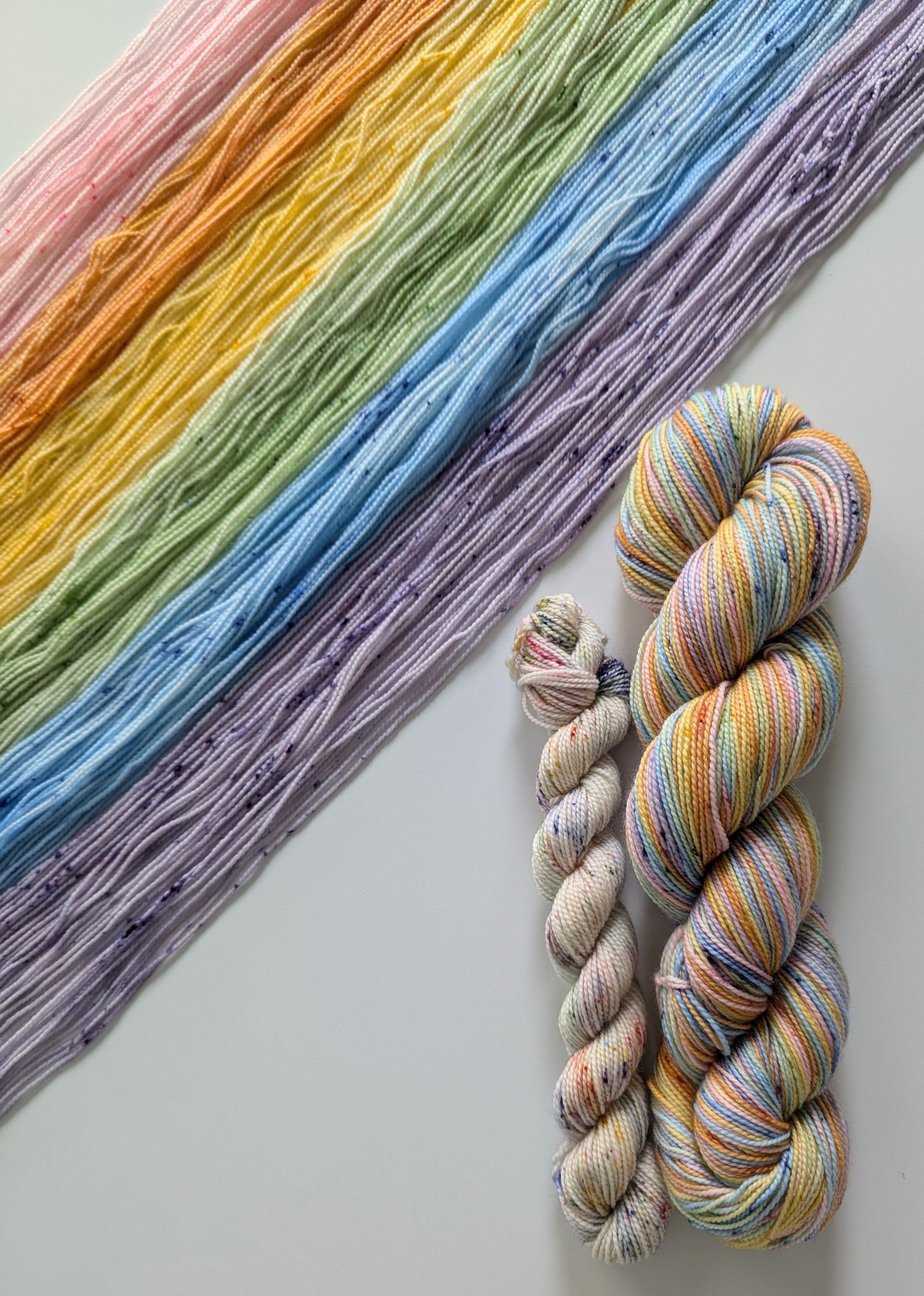 Sidewalk Chalk is an indie-dyed self-striping yarn from Yarns by Pear Maiden dyed in small batches with a beautiful sock weight yarn. This 2 ply sock yarn is a must have for sock knitters. This classic fingering weight yarn is made from soft merino wool with a touch of recycled nylon for hardiness. These self-striping skeins are ready to be knit up into your new favorite pair of socks. This superwash merino wool yarn is easy to care for, easy to find a pattern for, and easy to love!