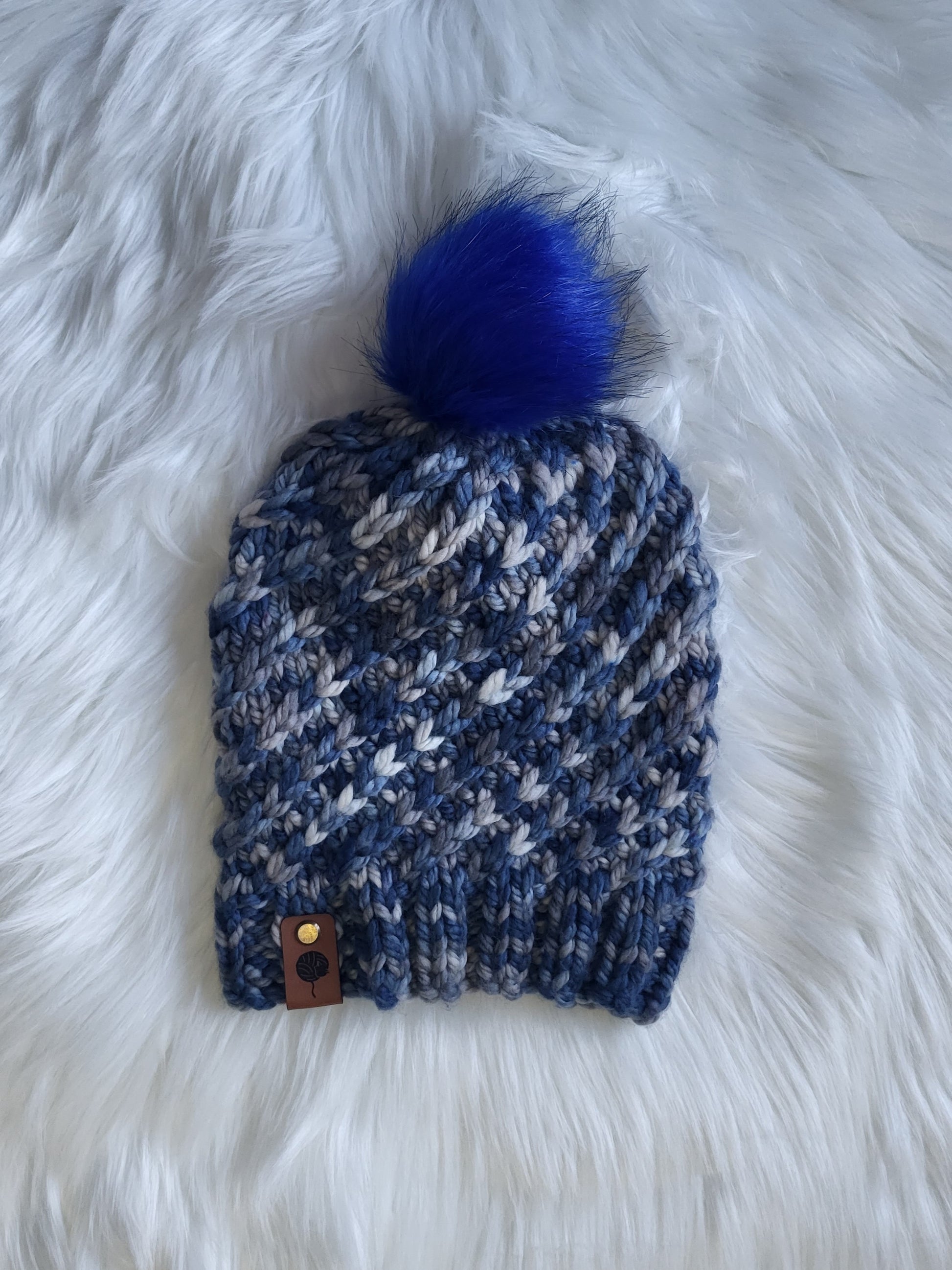 This chunky knit beanie is handmade in 100% Merino Wool yarn (Denim Dreams), soft to the touch, and perfect for the cold! This twisted beanie is super cute and comfy. The adult sizing is stretchy for your comfort. It is warm and extremely comfortable to wear throughout the cold weather. They do not come with a fold-over brim.